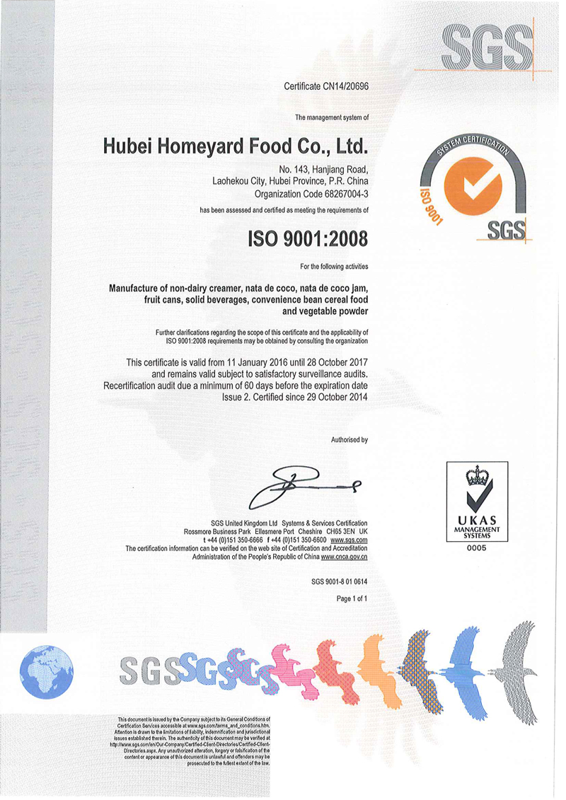 Hubei Homeyard Food Co.,Ltd is a high and new technology company specially engaged in technologic development ,production and sales of Food Ingredients.Established in 2009, we have possessed of the production scale of 60 thousand tons of non dairy creamer , 100 thousand tons of nata de coco and popping boba, 40 thousand tons of canned foods, 30 thousand tons of grain and fruit powder. Our products are sold well in 26 province of China and also have been exported to foreign country such as Korea, Vietnam, Thailand, Japen, Russia, Myanmar ,ect.